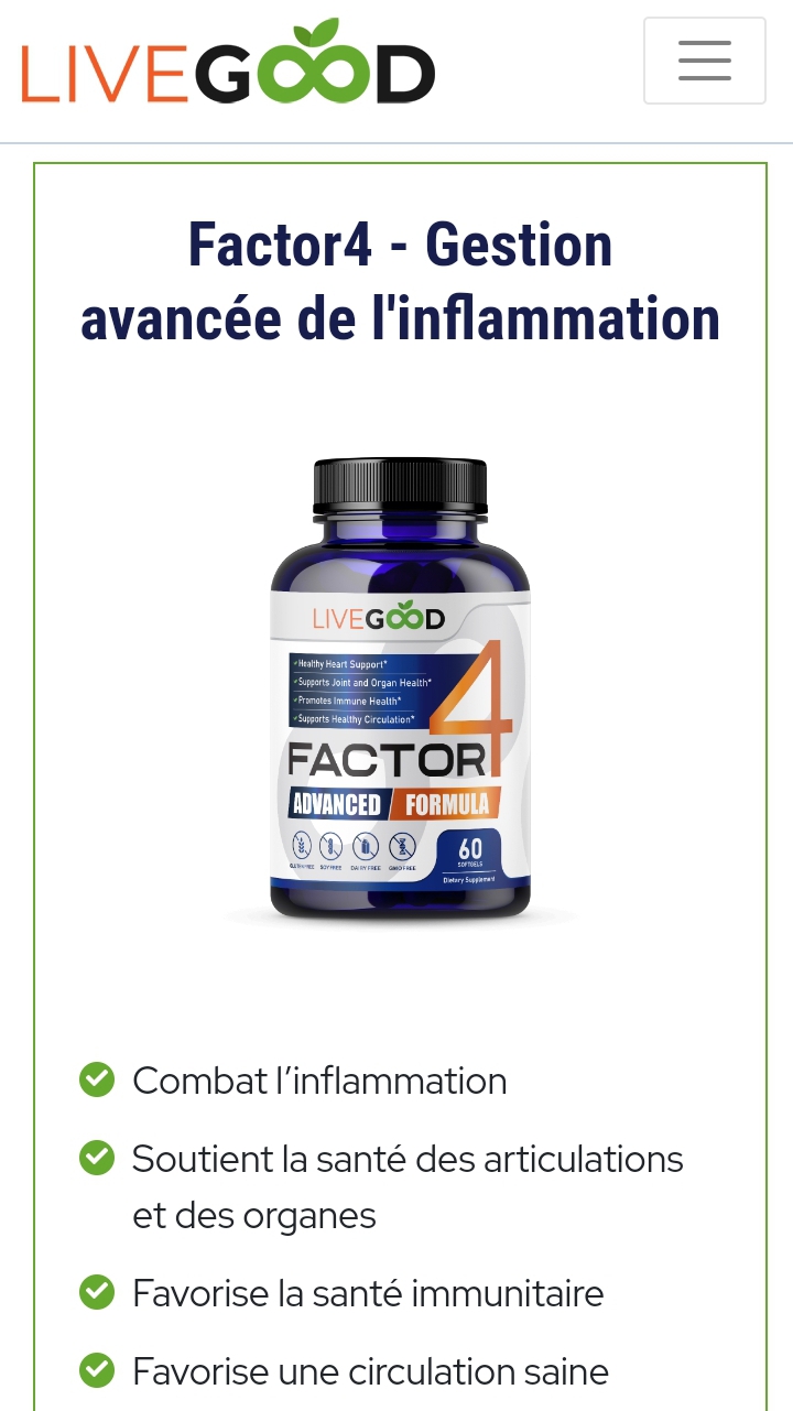 Fièrement formulé par l'un des meilleurs immunologistes au monde, le Dr Heather Volpp, le Facteur 4 de LiveGood est le premier et le seul supplément de gestion de l'inflammation formulé avec 4 des ingrédients anti-inflammatoires les plus puissants au monde ; Huile de poisson, curcuma, coenzyme Q10 et ail, pour vous aider à CONTRÔLER et même INVERSER l'inflammation !