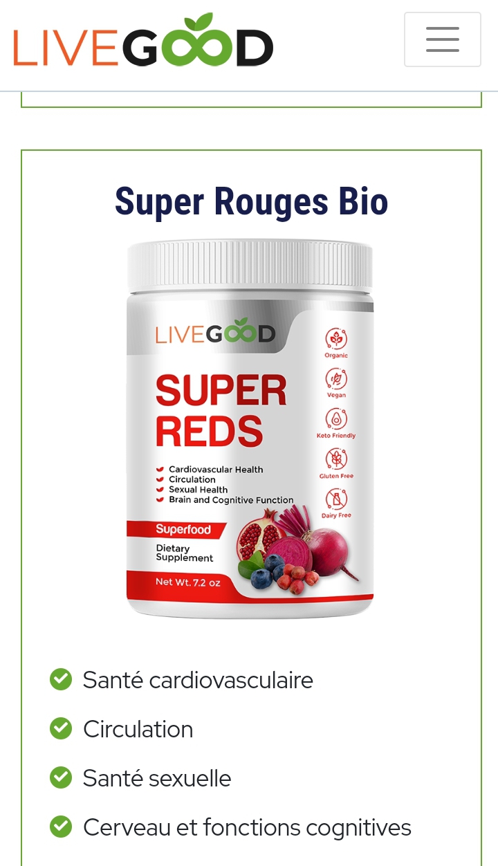 C'est pourquoi nous avons créé LiveGood Super Reds ! Nos Super Reds biologiques contiennent la plus grande quantité d'extraits de fruits et de légumes connus pour aider à améliorer la circulation sanguine en augmentant la production d'oxyde nitrique de notre corps, en stimulant la circulation sanguine, en soutenant les fonctions cérébrales et cognitives, la santé sexuelle, la santé cardiaque, la fonction immunitaire et en aidant à maximiser la santé globale de votre corps !