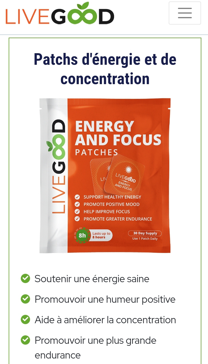 Les patchs LiveGood Healthy Energy and Focus fournissent un mélange unique d'ingrédients naturels, sains et hautement absorbables directement à travers la peau et dans la circulation sanguine pour fournir un regain d'énergie soutenu et rajeunissant qui dure des heures.