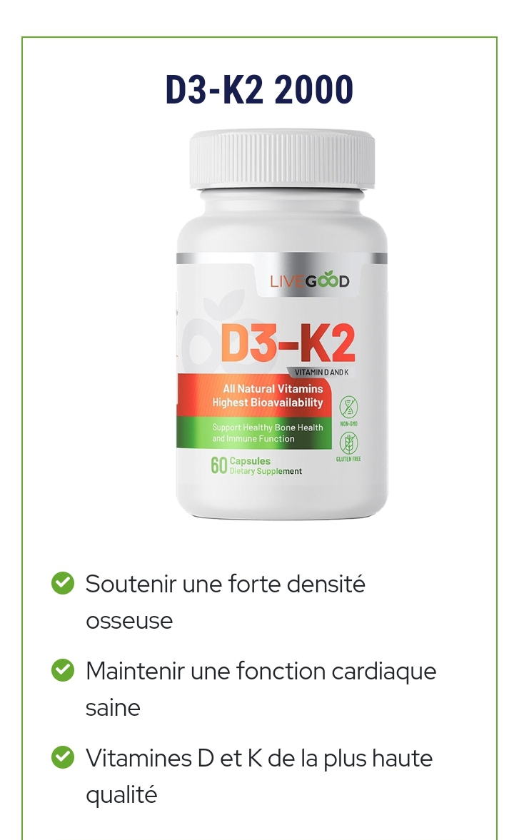 Les vitamines D3 et K2 de LiveGood, avec 2 000 unités de D3, offrent à votre corps la vitamine D de la plus haute qualité disponible partout, à des niveaux optimaux afin que vous puissiez tirer le meilleur parti de chaque dose.